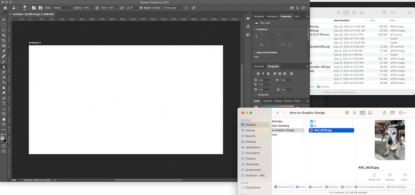 Because we are working with a document size that is different than the original dog photo, we to scale the image to the size they want. To do this, make sure you’re in the Move tool and on the correct layer. Then, go to Edit > Transform (cmd-T, ctrl-T). This brings up control bars on the corners and sides of the images so you can drag these points around and resize the image.